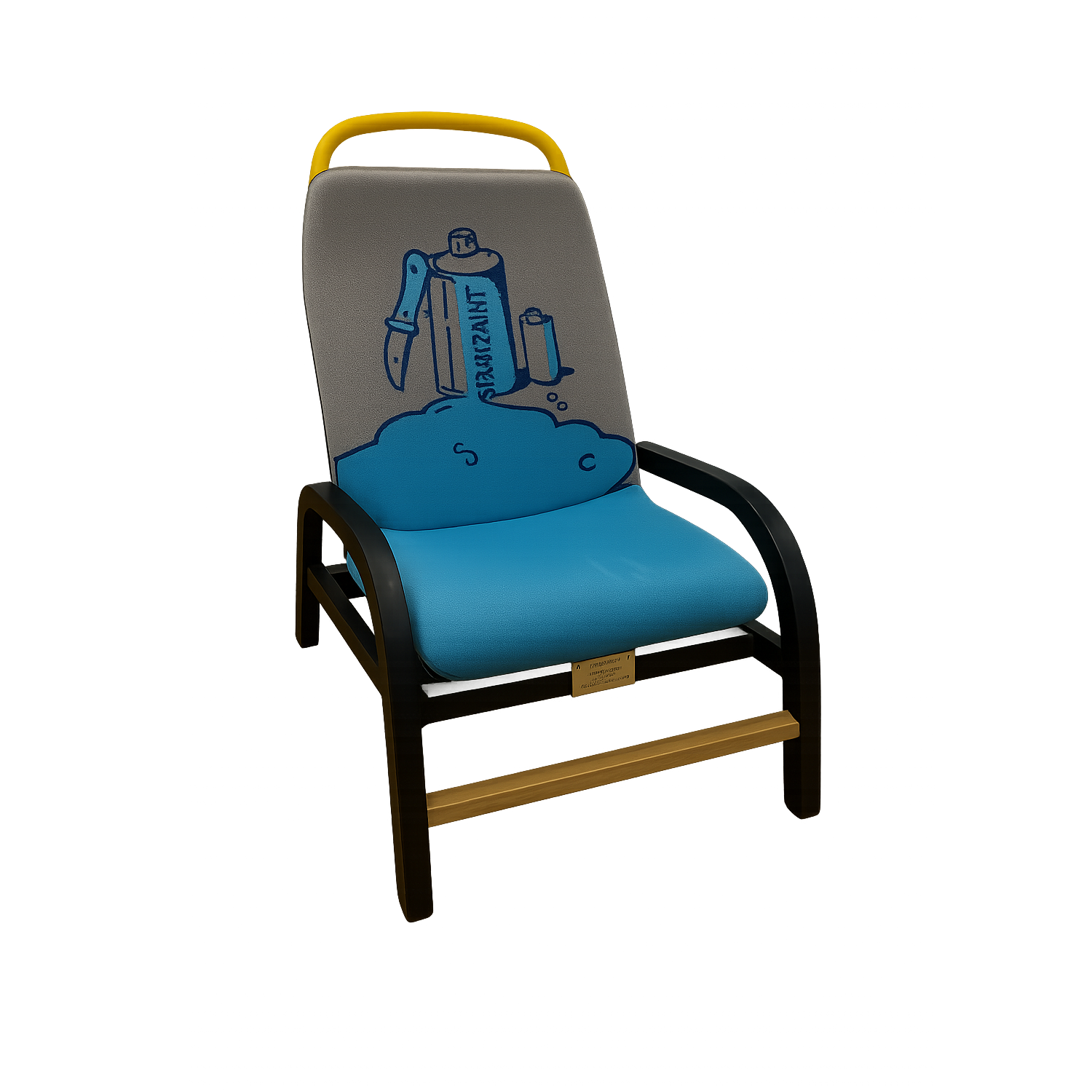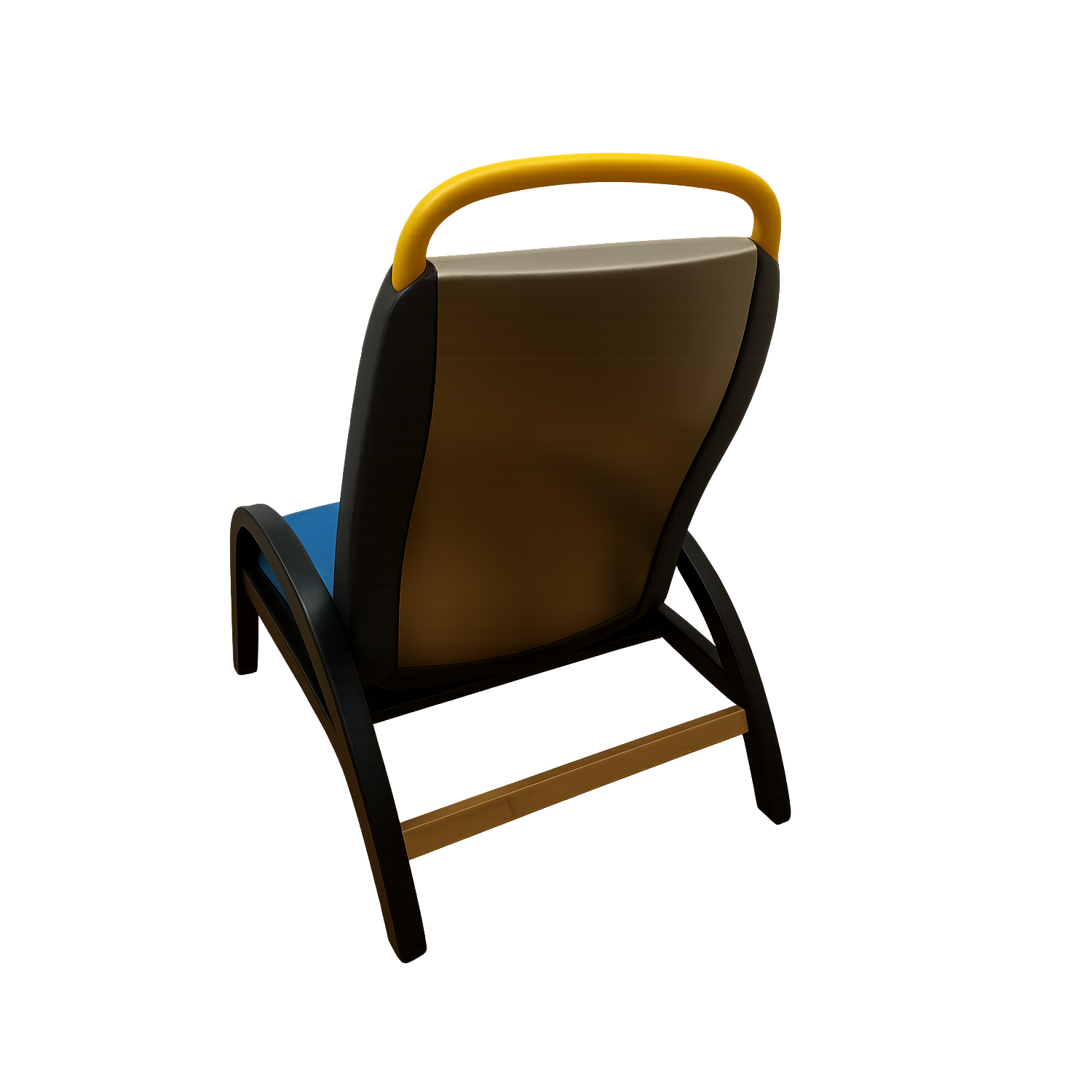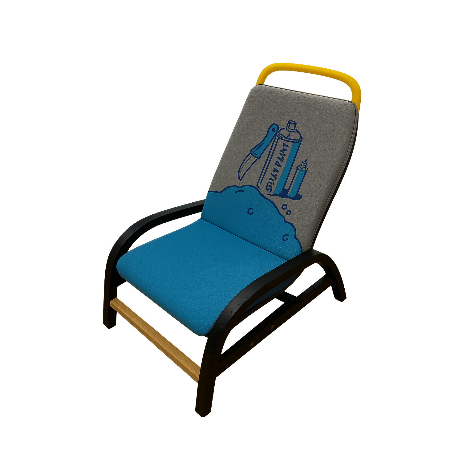 Couleurs et Matières : Tissus bleu et gris, poignée en plastique jaune, arrière métal chromé